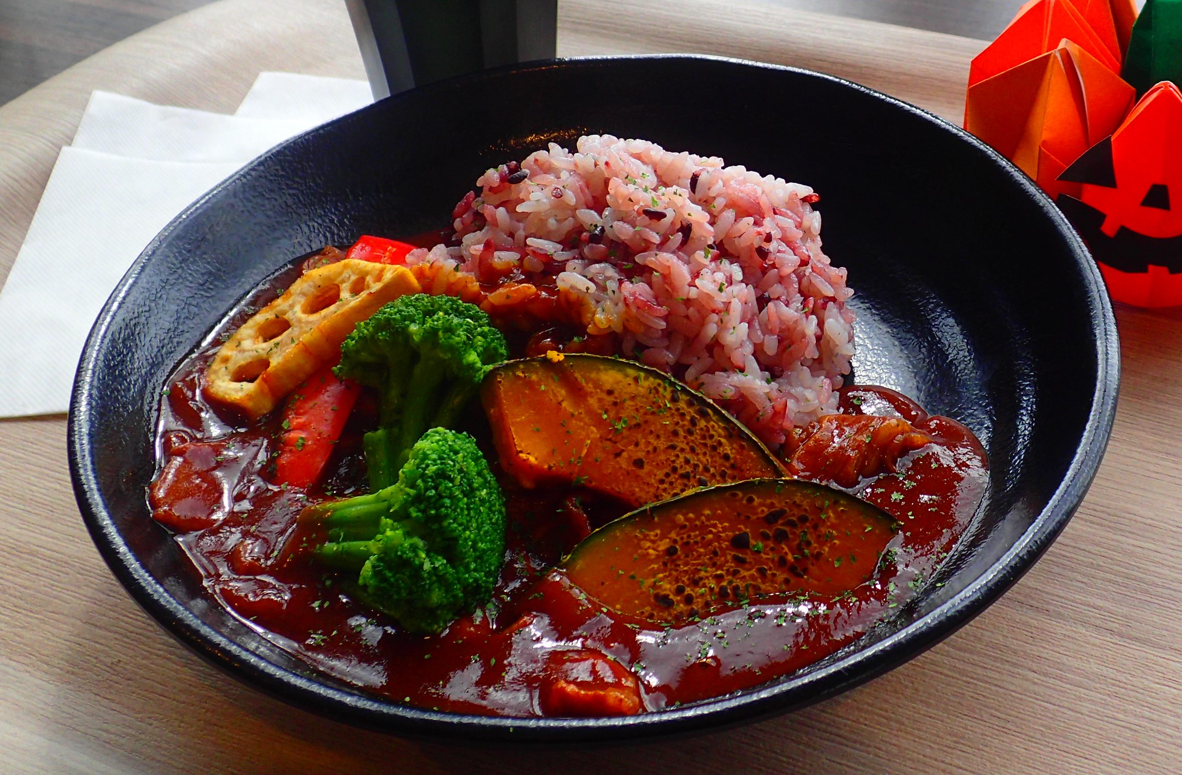 お米は黒米を混ぜることで赤っぽくなり、カボチャが交差していて、なんだかコウモリを表してるようにも見えます🦇